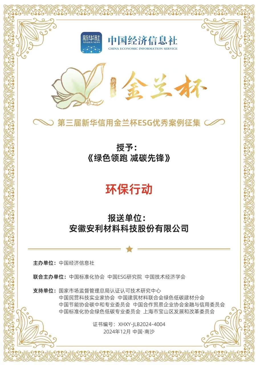 近日,第三届新华信用金兰杯ESG优秀案例正式发布,安利股份(300218.SZ)凭借“绿色领跑 减碳先锋”案例,荣获ESG“环保行动”优秀案例。