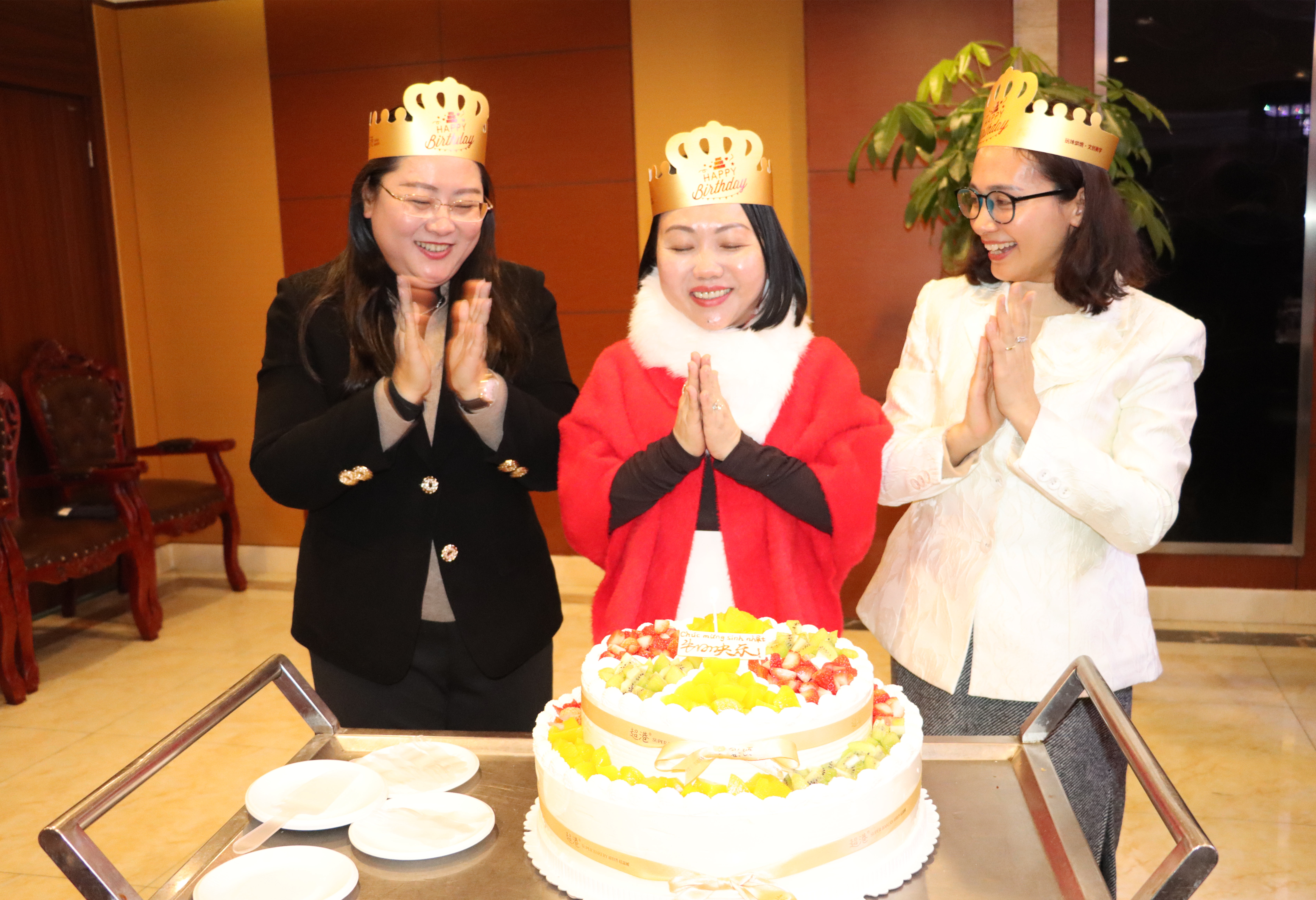 考察当天,恰逢代表团三位成员的生日,公司在晚宴中为生日主角送上蛋糕和鲜花,并互赠礼物。