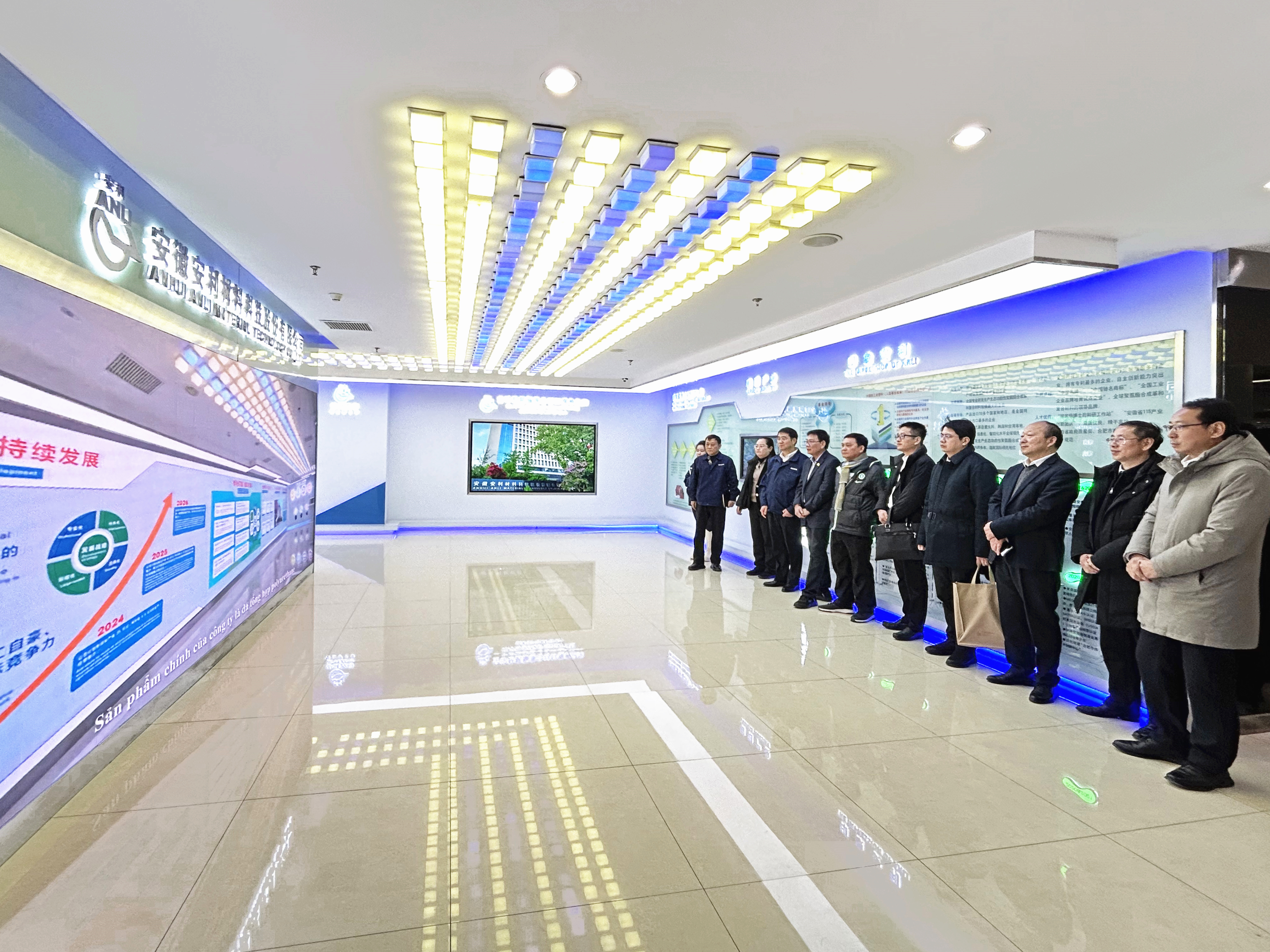 代表团一行参观了安利形象展厅,通过观看企业宣传片,充分了解安利股份和安利越南发展历程、产品应用、技术创新、绿色环保等情况。一行人被展厅内琳琅满目、色彩亮丽的聚氨酯复合材料样品所吸引,连连称赞,并不时驻足观察、拍照记录。