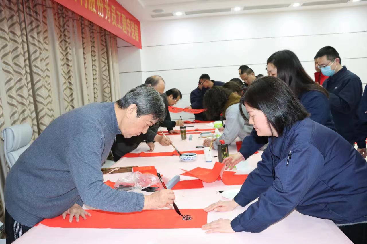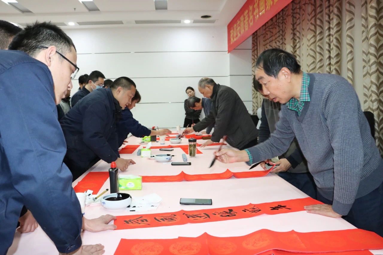 前来领取春联的员工早早地来到了行政楼一楼等候着,兴致盎然地观赏书画家们热情创作。人群之中,书画家们铺红纸、润笔、蘸墨、挥毫,各显身手,笔下字迹或刚健质朴、或汪洋恣肆,或灵动秀气,将中国传统书法淋漓演绎。每一次起笔、每一次收势,都蕴含着对新春的美好祝愿和对未来的殷切期盼。“金蛇狂舞丰收岁、丹凤朝阳纳吉图”“灵蛇添百福、瑞霭映千家”……一副副吉祥喜庆的大红春联被传递到公司员工手中,为即将到来的蛇年添上了一抹喜庆的中国红。