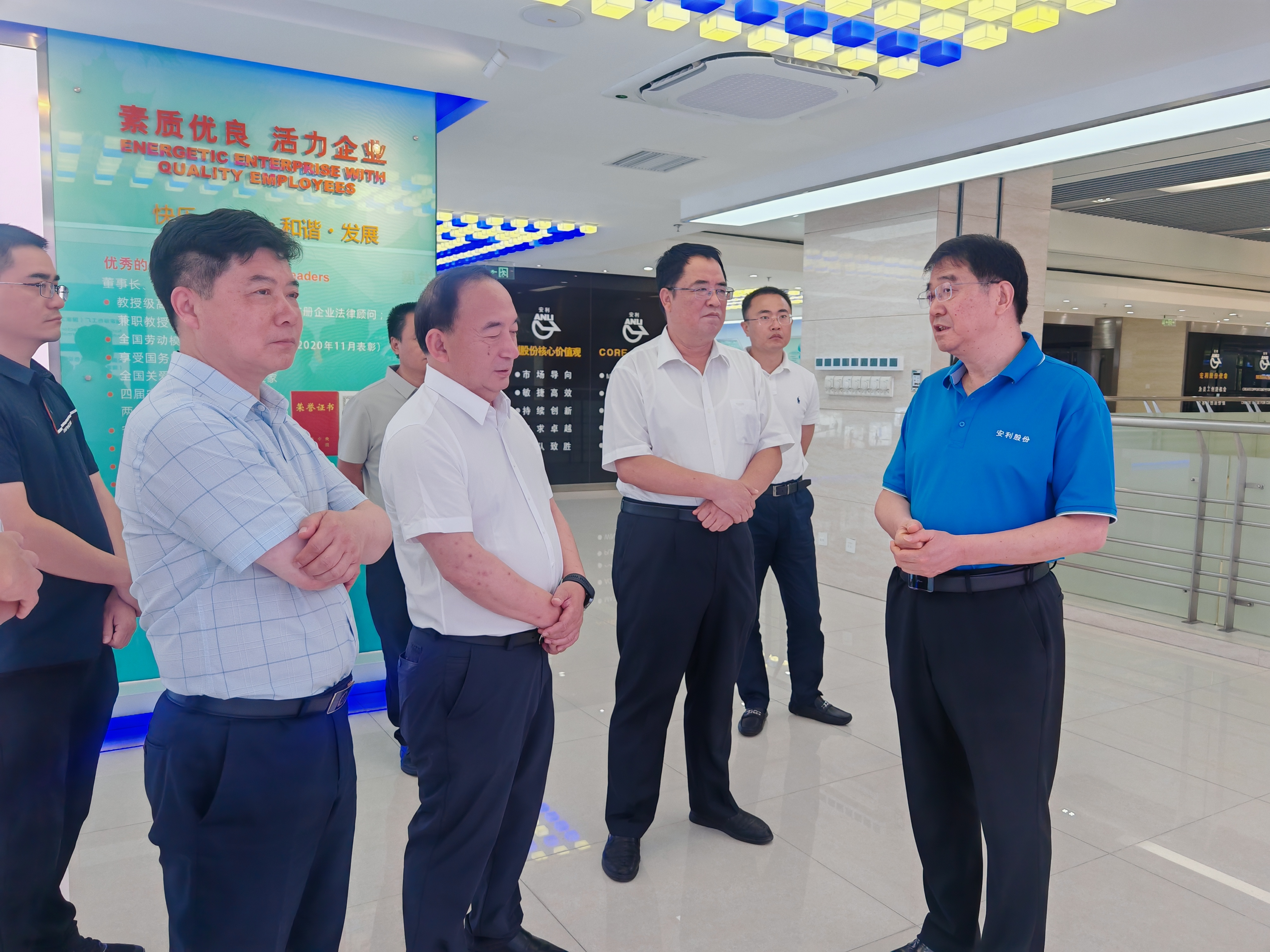 湖南省人大财经委一行参观了安利形象展厅,通过观看企业宣传片充分了解安利的发展历程、产品应用、技术创新、绿色环保等情况。他们对用途广、品种多、产品优、色彩鲜艳、功能多样的安利材料表现出了浓厚兴趣,对安利股份(300218.SZ)依靠创新驱动,成为“全国制造业单项冠军示范企业”“国家重点高新技术企业”“国家认定企业技术中心”“国家技术创新示范企业”“中国消费名品”交口称赞,纷纷表示肥西营商环境良好,发展氛围浓厚,成就了安利股份这样有格局、有目标、有情怀的优秀民营企业。丛培模一行诚挚祝愿安利股份进一步做大做强,越来越好,实现更高、更远的目标。